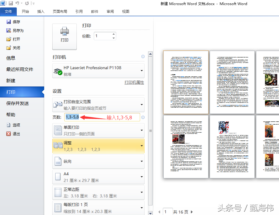 有时候文档内容太长,而我们只想打印其中某些页面,如:第3页到第5页,我们可以在【页数】中输入【3-5】。如果要打印某些单独不连续的页面时,如;第1页、第3-5页、第8页,我们可以在【页数】中输入;【1,3-5,8】(用逗号分隔),就会只打印出1、3、4、5、8页的内容。
