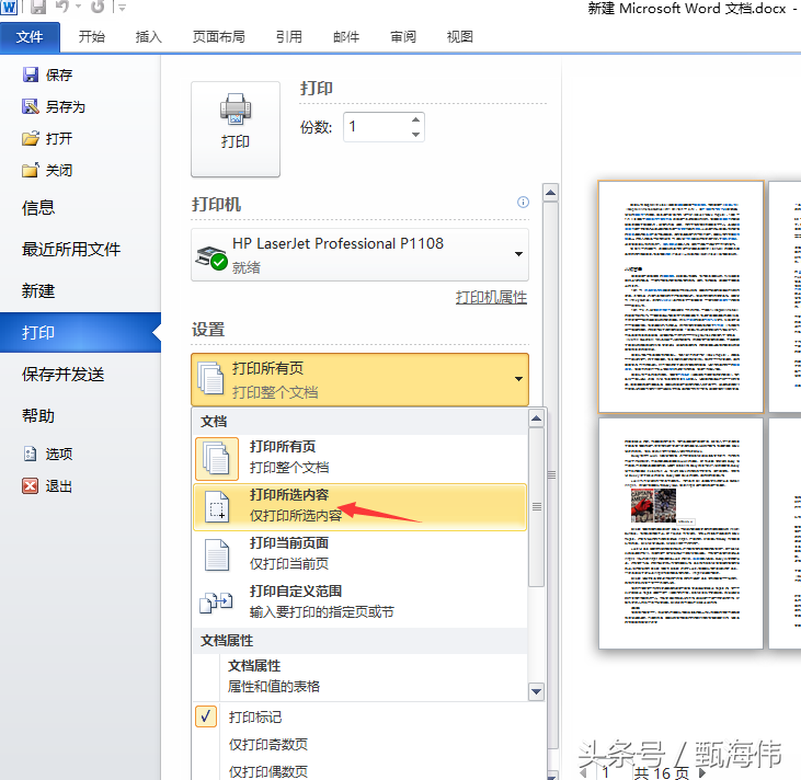 有时,我们只想要打印文档中的某段内容。首先要选中文档中所需要打印的某段内容,然后进入点击菜单栏【文件】---【打印】,选择设置中的【打印所选内容】即可。