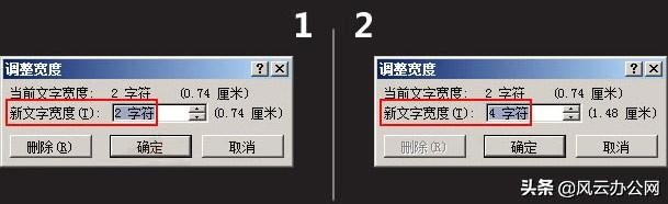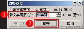 2、接着会弹出“调整宽度”对话框,可以看到新文字宽度默认为2个字符,可以根据需要将新文字宽度设置为“4字符”或其他,如下图所示。