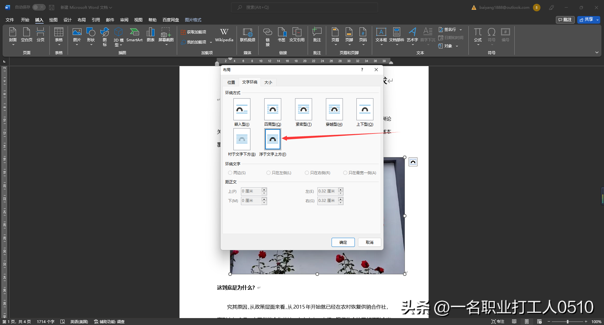2、弹出布局对话框,切换到文字环绕选项卡,在环绕方式组合框中选择浮于文字上方选项卡,然后单击确定按钮即可。