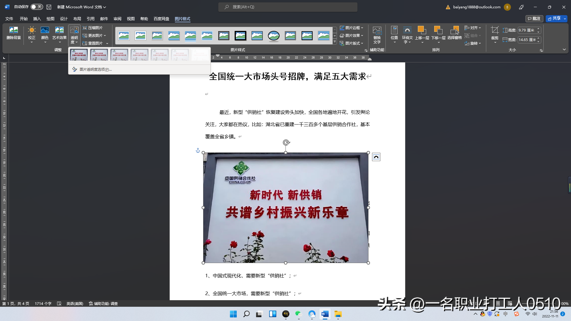 3、选中该图片,切换到图片格式选项卡,在调整组中单透明色 按钮,在弹出的下拉列表框中选择透明度65%选项
