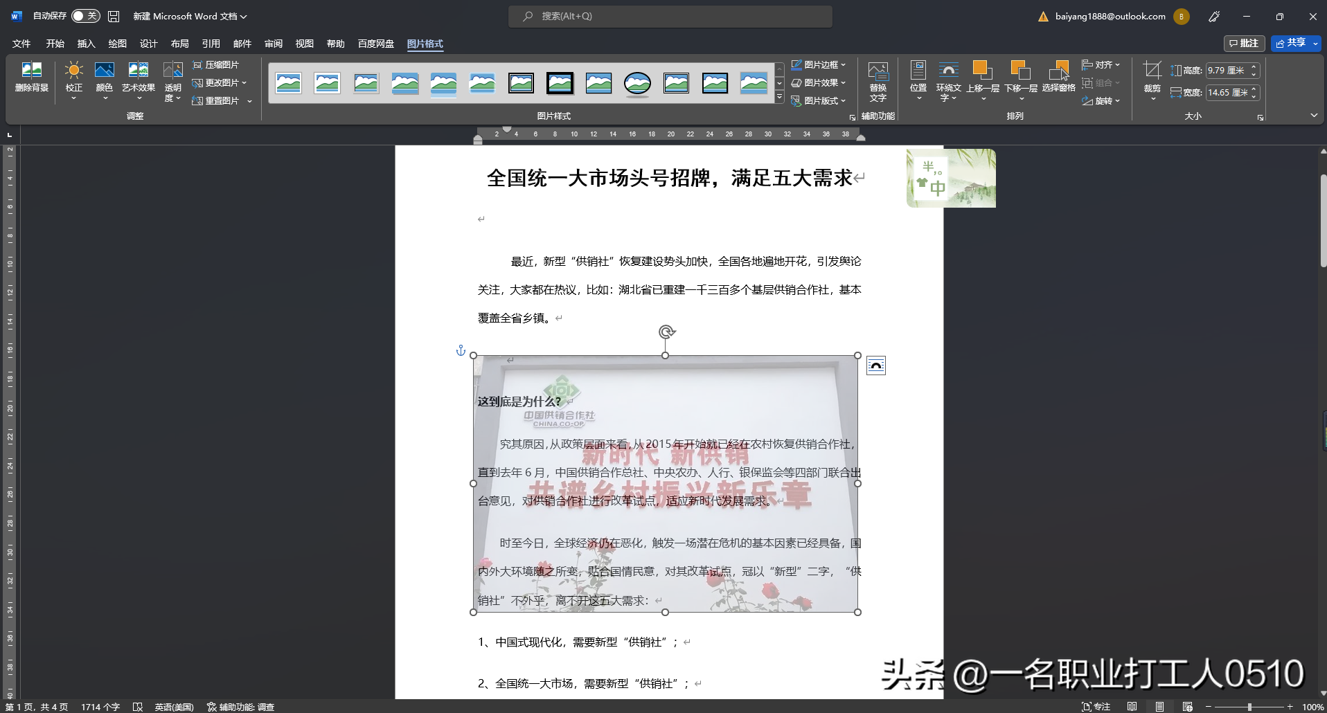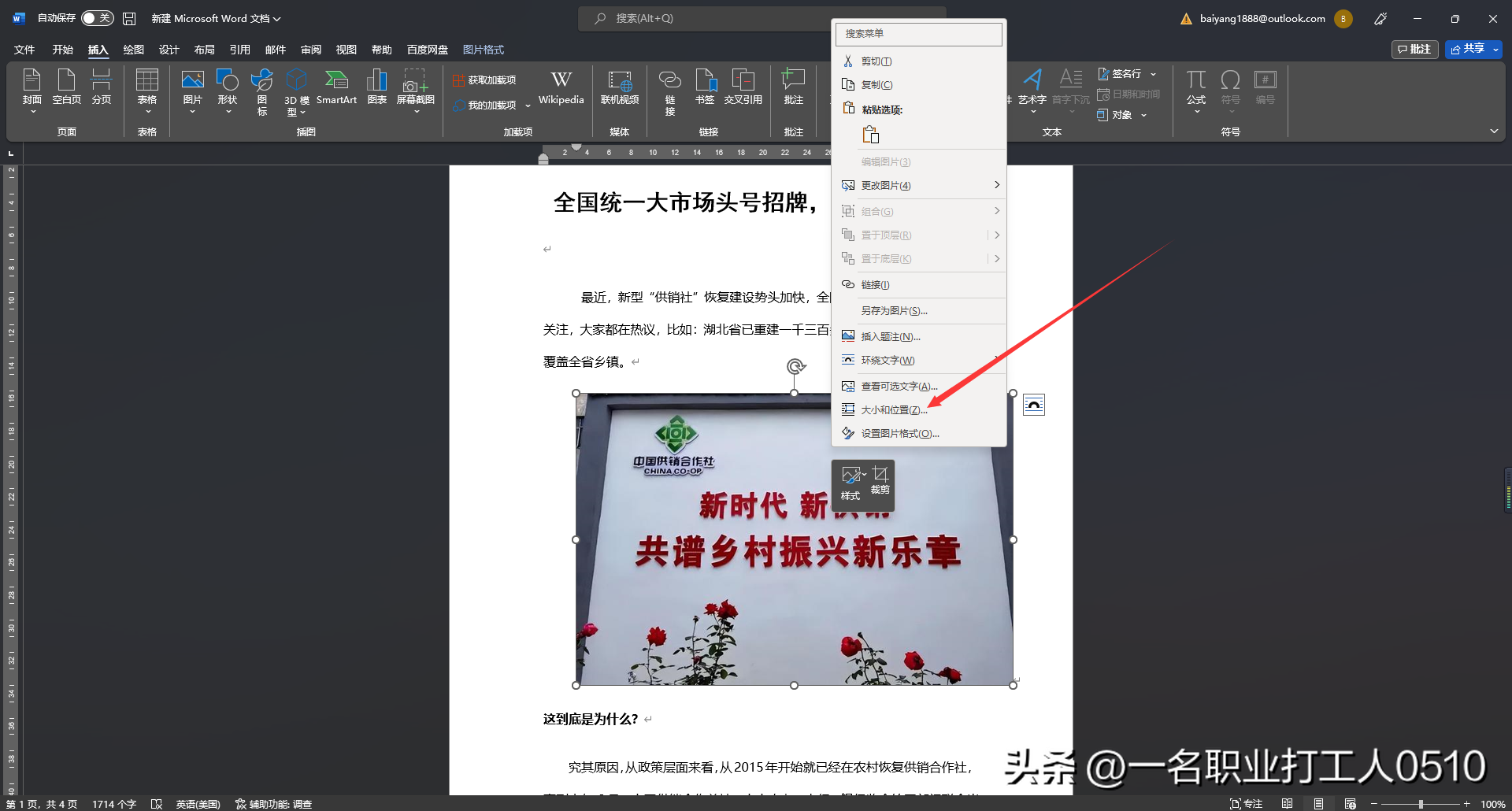 1、选中该图片,然后单击鼠标右键,在弹出的快捷菜单中选择大小和位置