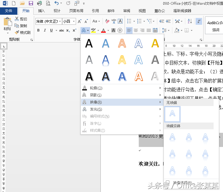 Word2013更是增加了文字设置包括阴影、映像和三维格式在内的多种特效。选中目标文本,切换到【开始】选项卡,在【字体】组找中,点击【文字效果和版式】功能的下三角按钮,弹出微软设置好的文字效果样式,以及轮廓、阴影、映像等功能按键,点击可查看设置效果。