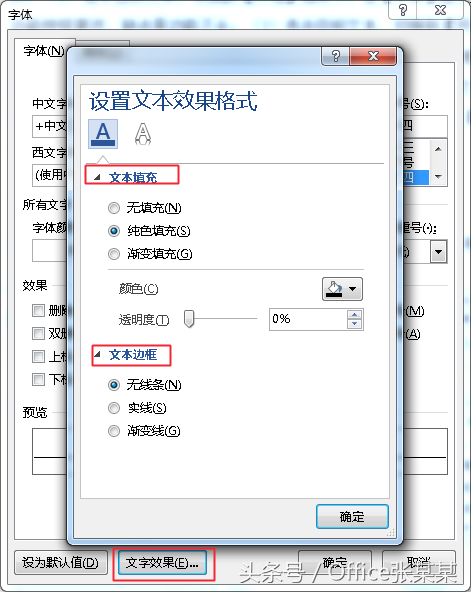 也可以切换到【开始】选项卡,在【字体】组中,点击右下角的扩展按钮,弹出【字体】对话框,点击下方【文字效果】功能按钮,弹出【设置文本效果格式】对话框,在此可以设置文本填充、文本边框、阴影、映像等设置。
