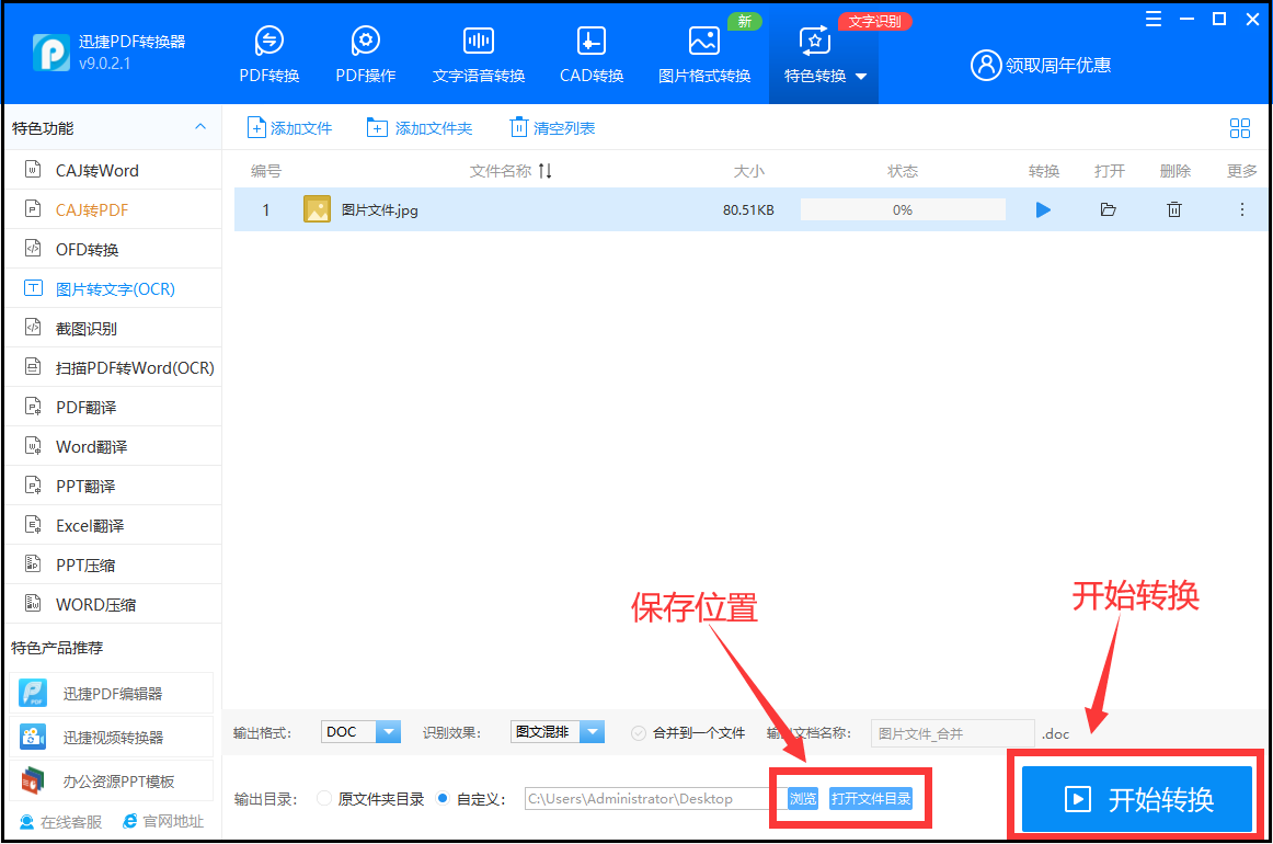 ③ 最后一步,当把所有选项设置好后,在页面下方把文件转换后的保存位置设置一下,点击【开始转换】,这样图片中的内容就会转换成word文档啦。是不是很简单呢。