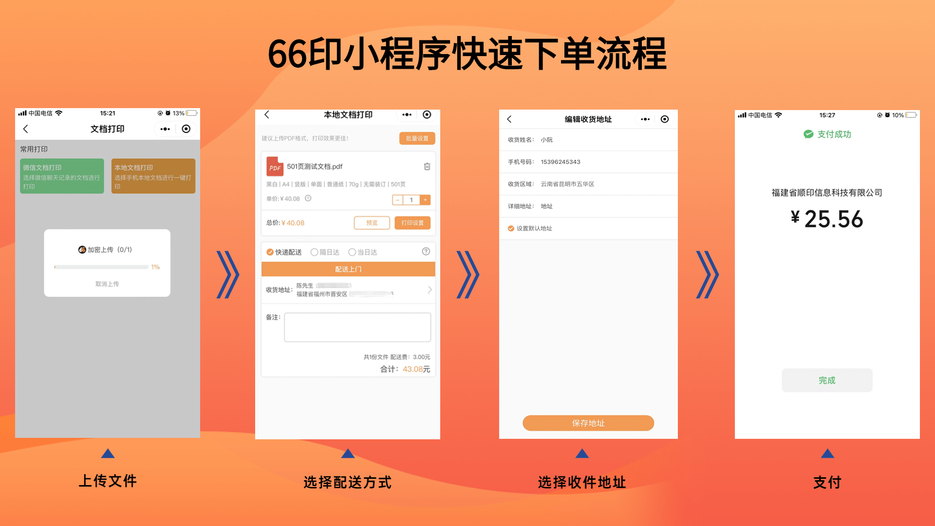 在微信小程序搜索框内搜索:66印自助打印 → 点击文档打印 → 本地文档打印 → 选择手机里要打印文件然后点击确认 → 选择打印规格及配送方式后点击立即打印并支付,然后就等着文件送上门啦!有打印需求的小伙伴可以上去体验一下。
