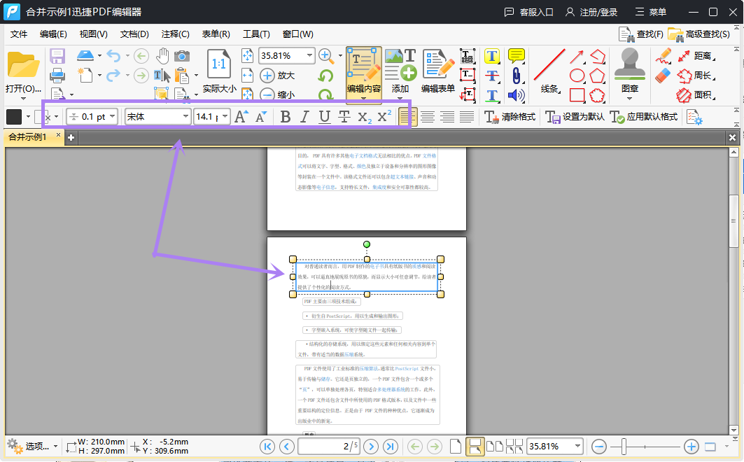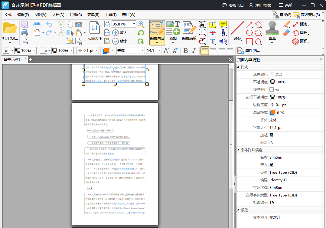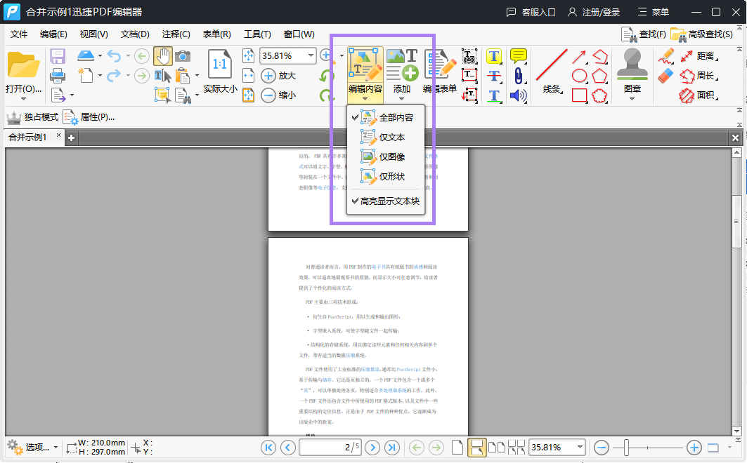 ②.PDF文件添加进来之后,在编辑板块中点击“编辑内容”,看到该功能有四个选项:“所有内容”、“仅文本”、“仅图像”和“仅形状”。因为我们需要编辑文本内容,所以我们选择了“仅文本”选项,然后我们可以发现pdf文件中的文本是可以编辑的。