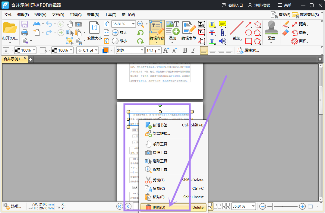 ④.如果我们想删除整段呢?方法很简单,只需在“内容编辑”中点击“仅文字”,然后选中整段文字,右键点击“删除”按钮即可!我们还可以拖动选框来移动文字的位置~