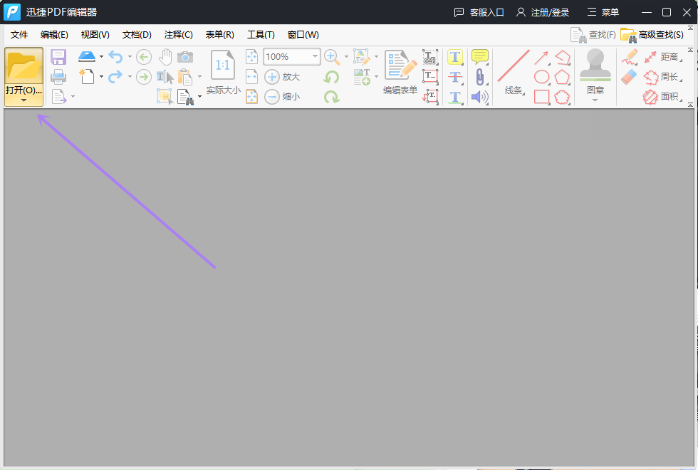 ①.首先在电脑中打开“迅捷PDF编辑器”,点击顶部的“打开”按钮,在弹出的浏览框中选择需要编辑文本内容的PDF文件。