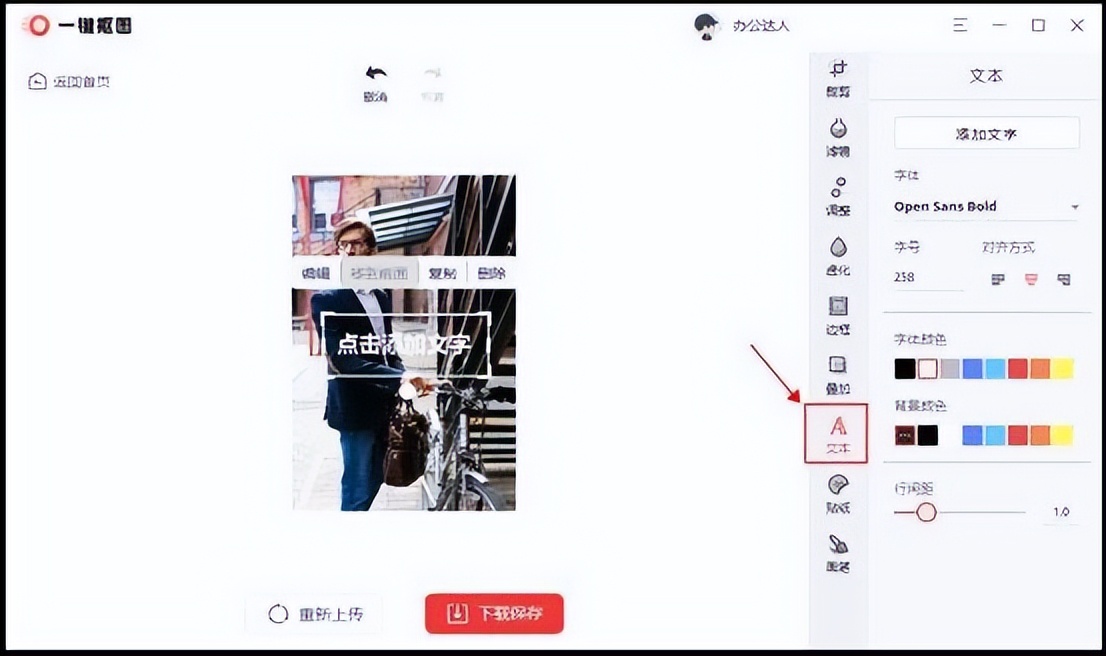 打开软件之后我们找到【图片编辑】的功能,然后导入图片,点击【文本】。可以自由选择文本的样式和颜色,也可以选择字体,给文字添加颜色,相当丰富。