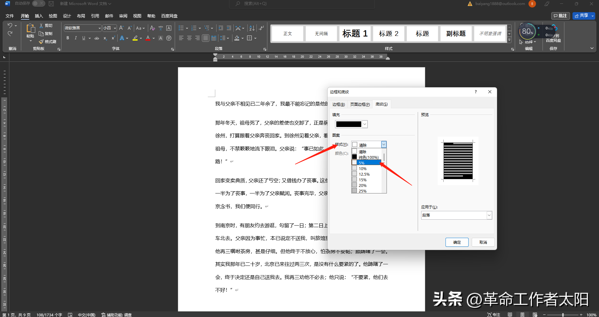 5、在图案组中的样式下拉列表框中选择5%选项,颜色为白色