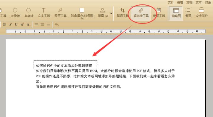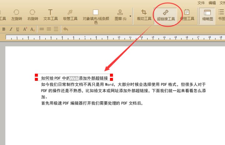 首先用极速PDF编辑器打开我们需要处理的PDF文档后,选择编辑器菜单栏中的“超链接工具”并在PDF文本中按住鼠标左键框选出需要添加超链接的部分。