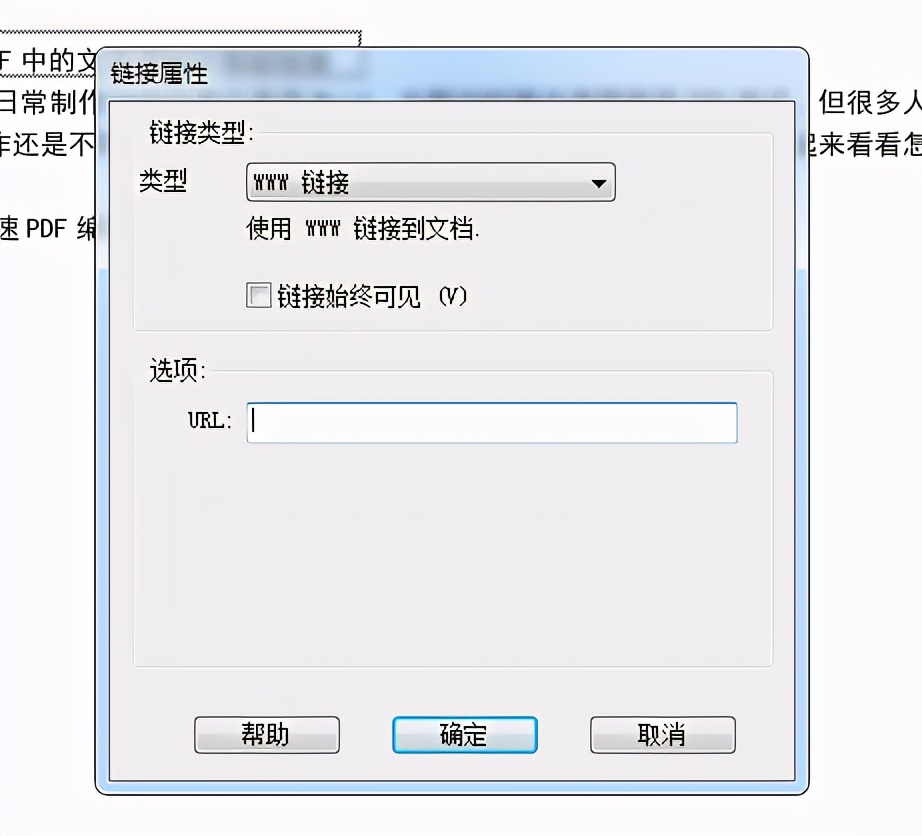 接着会弹出设置超链接的窗口,一般常用的就是“转到视图”和“WWW链接”,其中转到视图是指点击文本跳转到本PDF文件中对应的页面位置;而“WWW链接”则是我们常用的添加外部链接并打开网页的方式了。