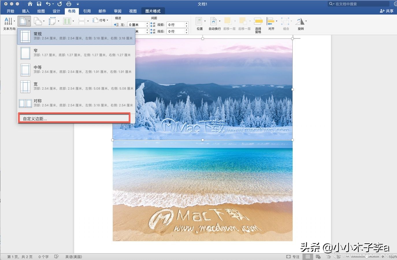 1、选中word文档中图片,在菜单栏中选择【布局】—【页边距】,如下图所示: