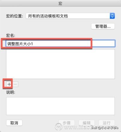 5、在打开的宏设置窗口中,为要编辑的宏设置一个名称,如【调整照片大小1】,然后点击左侧的【创建】按钮,如下图所示: