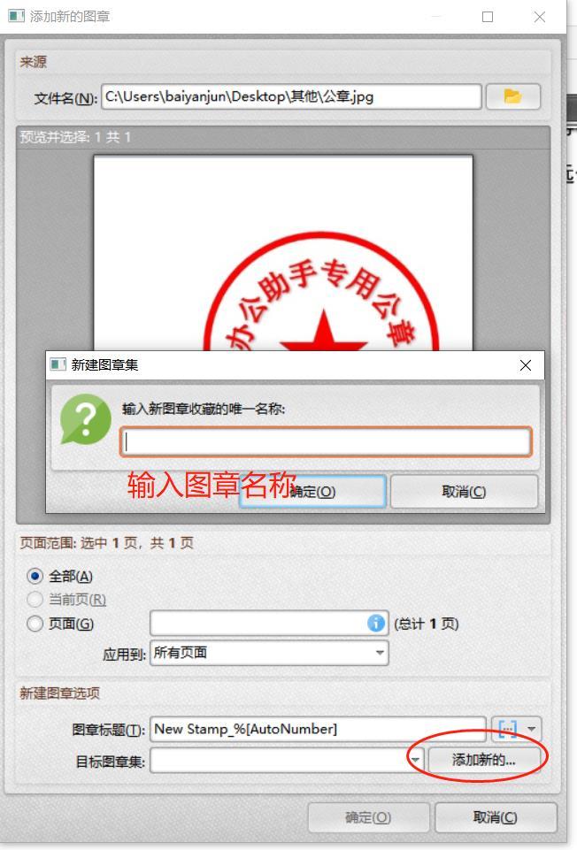 7、在添加图章对话框中,选择添加新的目标图章集,然后更改新图章的名称,点击确定。