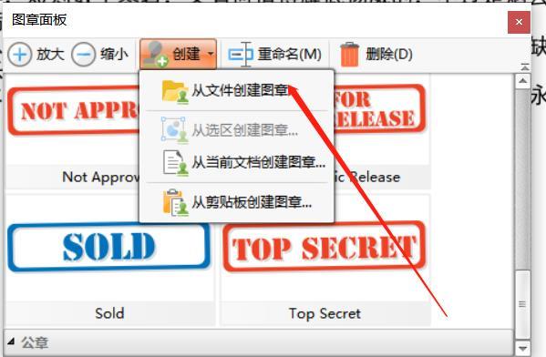 5、在弹出的图章面板窗口中,点击“创建”下拉列表中的“文件夹图标”,选择从文件创建图章。
