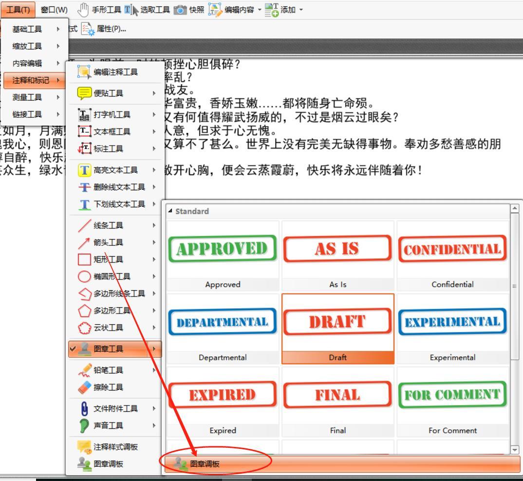 2、依次点击“工具”-“注释和标记”-“图章工具”,然后选择要添加的图章。