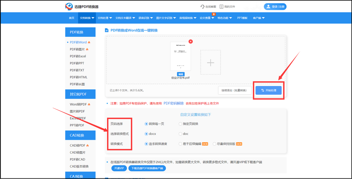 ③ 添加进来后就可以实行转换了,我们设置一下页码以及格式选择,设置完毕后,点击【开始处理】,等一小会后就转换成功啦。