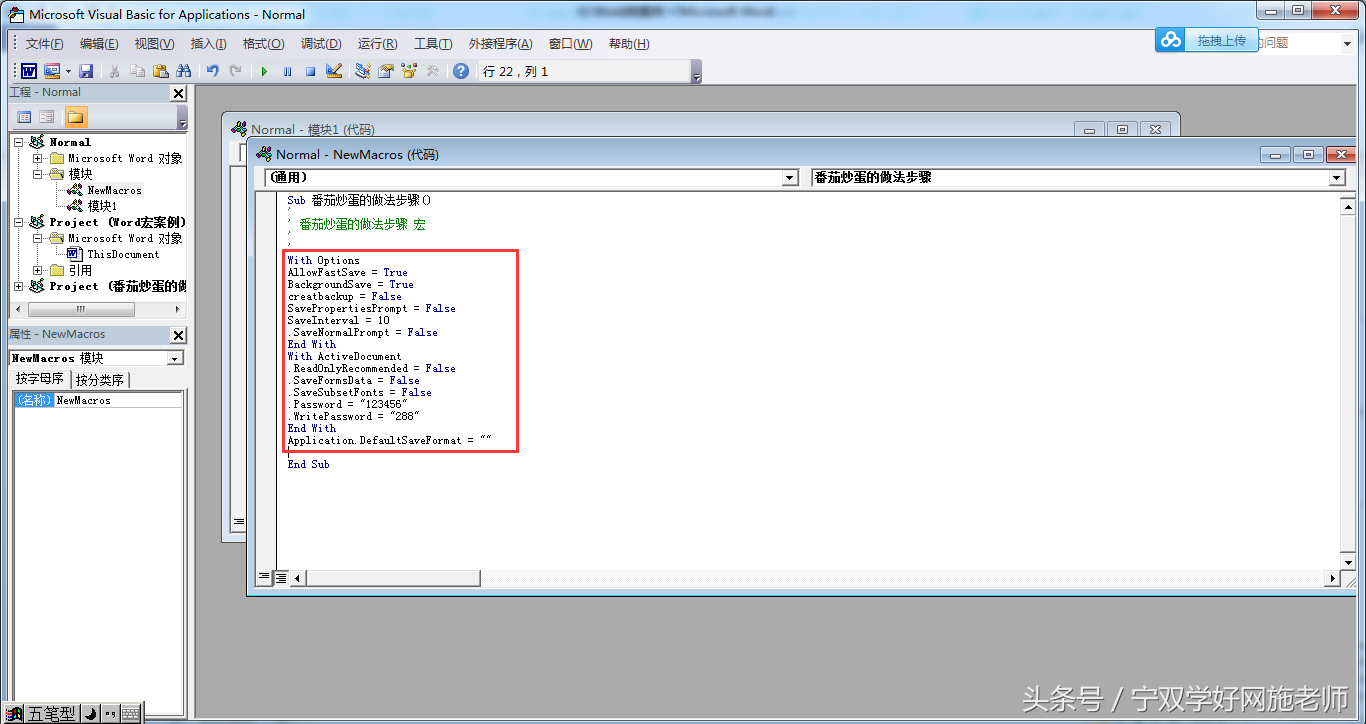 对于职场人来说,工作中许多文件都有着非常高的机密,特别是一些财务库存销售方面的文档,恨不得每个都加密保存。但是对于手动一步一步的去操作加密,也是非常繁琐的事情,在这里宁双学好网施老师讲解WORD文档一键加密,这里利用到了宏。只需一键即可给文件加密。