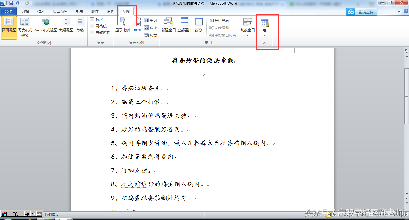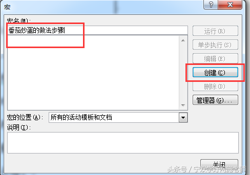 一、首先,我们进入《视图》中的《宏》,点击《宏》。在弹出的对话框中我们将名称输入一下,这里我输入的是《番茄炒蛋的做法步骤》,你们可以自行修改。输入完成后点击《创建》按钮。