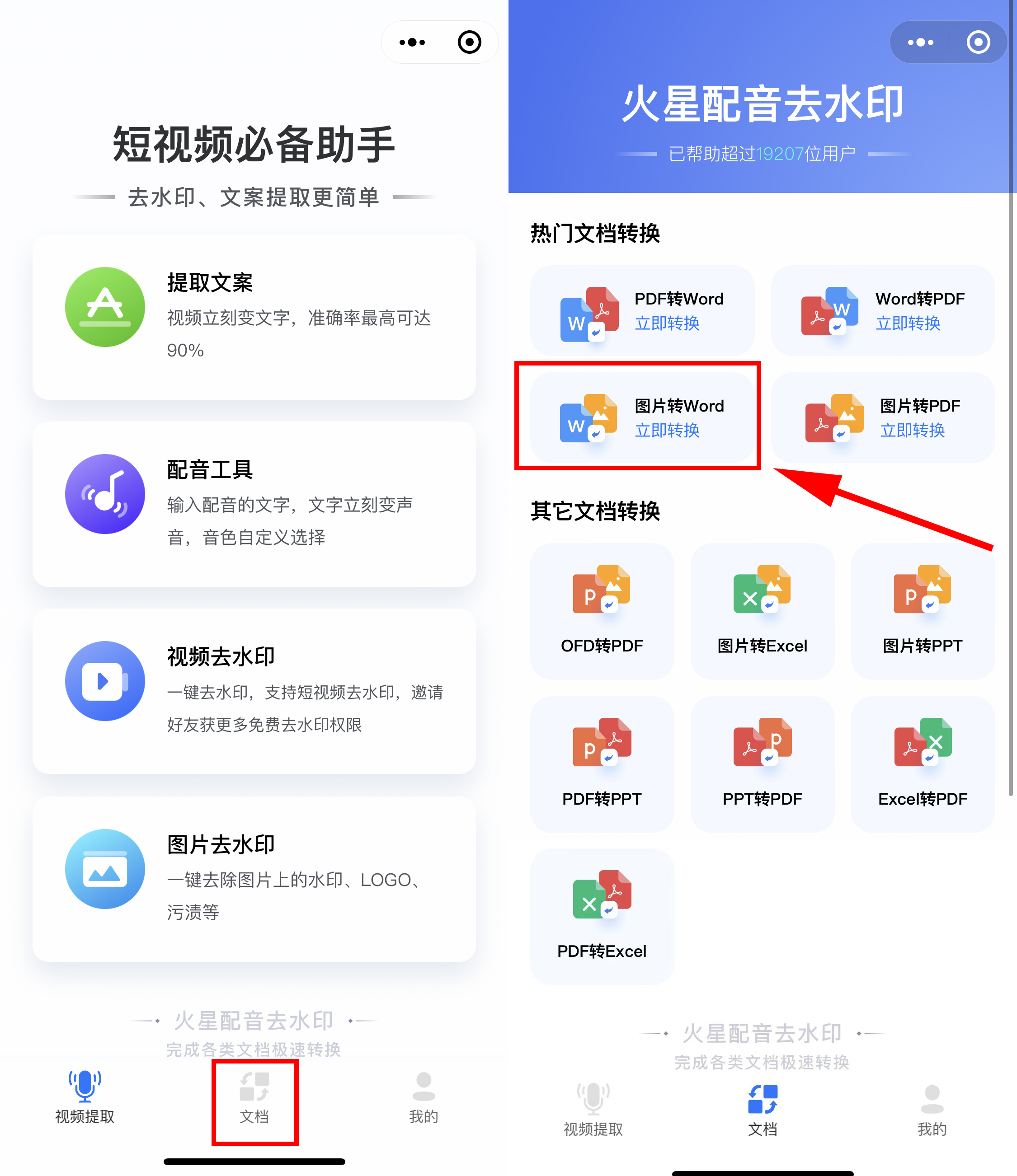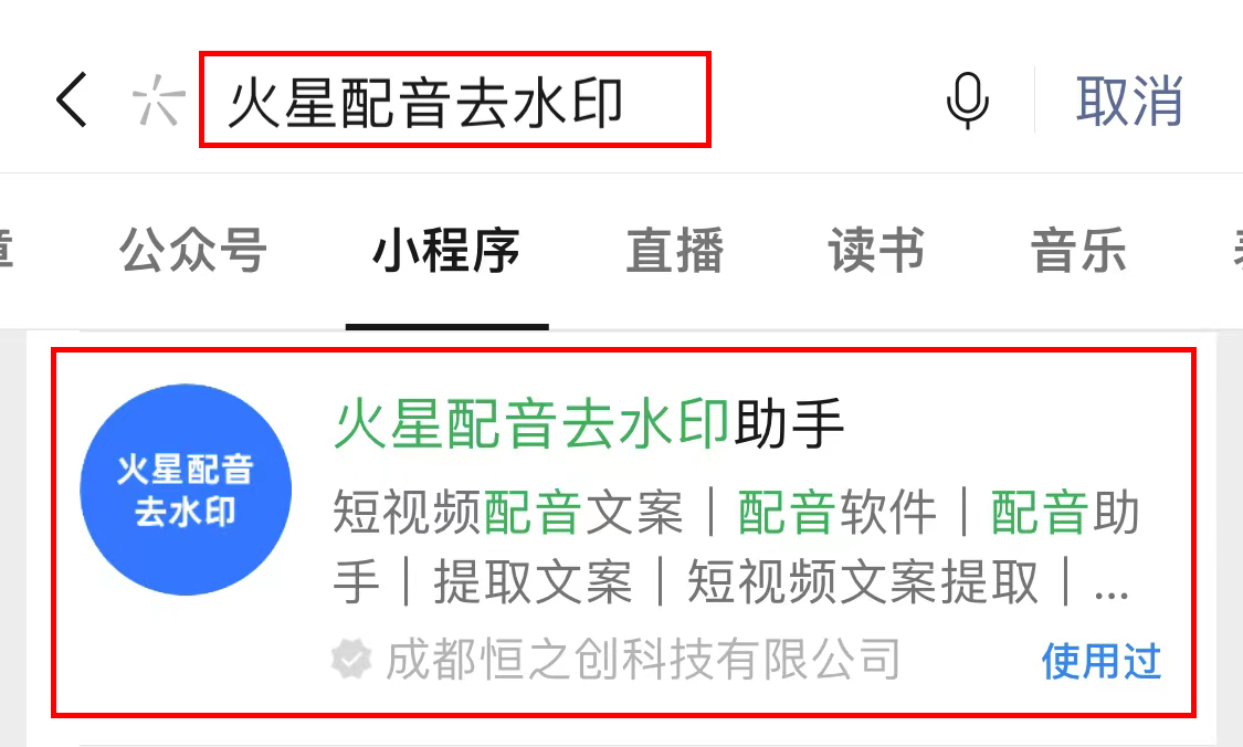我们在转换文档前,先需要在小程序搜索栏搜索“火星配音去水印”,找到点击进入,我们利用这个小程序工具来转换文档。