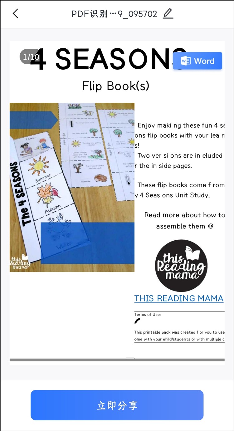 第五步:pdf纯图片的内容转换成word,可以在word中进行编辑,点击“立即分享”,将分享到其他渠道或发送给他人。
