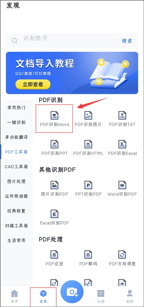 第一步:主界面下方,点击“发现”,并在页面功能区域找到“PDF工具箱”,点击“PDF识别Word”;