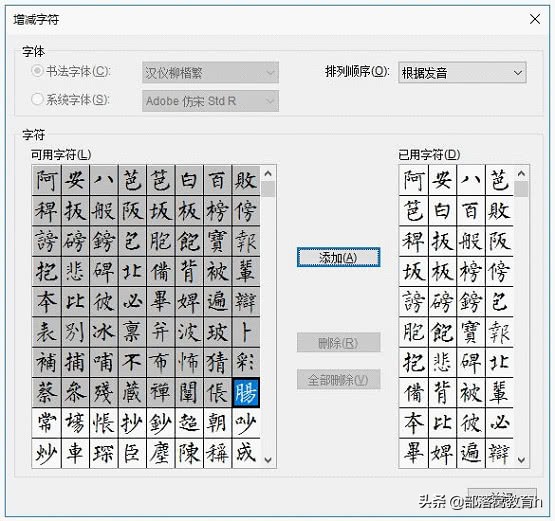 2.点击书法字帖,打开“增减字符”对话框。单击“书法字体”,选择喜欢的字体(也可用系统自带字体);然后在"可用字符"列表框中选择需要的字符,添加到右侧"已用字符"的列表框。