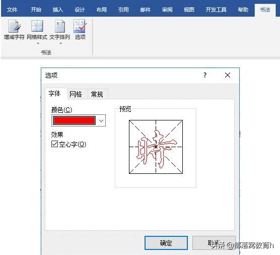 技巧扩展:字帖模板创建好之后,如果你对网格样式、文字排列方式、字体颜色等格式不满意,可以进行修改。选择”书法“选项卡,在”书法“功能区对应选项中进行设置。