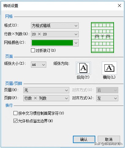 2.打开“稿纸设置”对话框,在”格式“下拉列表中选择”方格式稿纸“,行数、列数以及网格颜色可进行自定义设置。