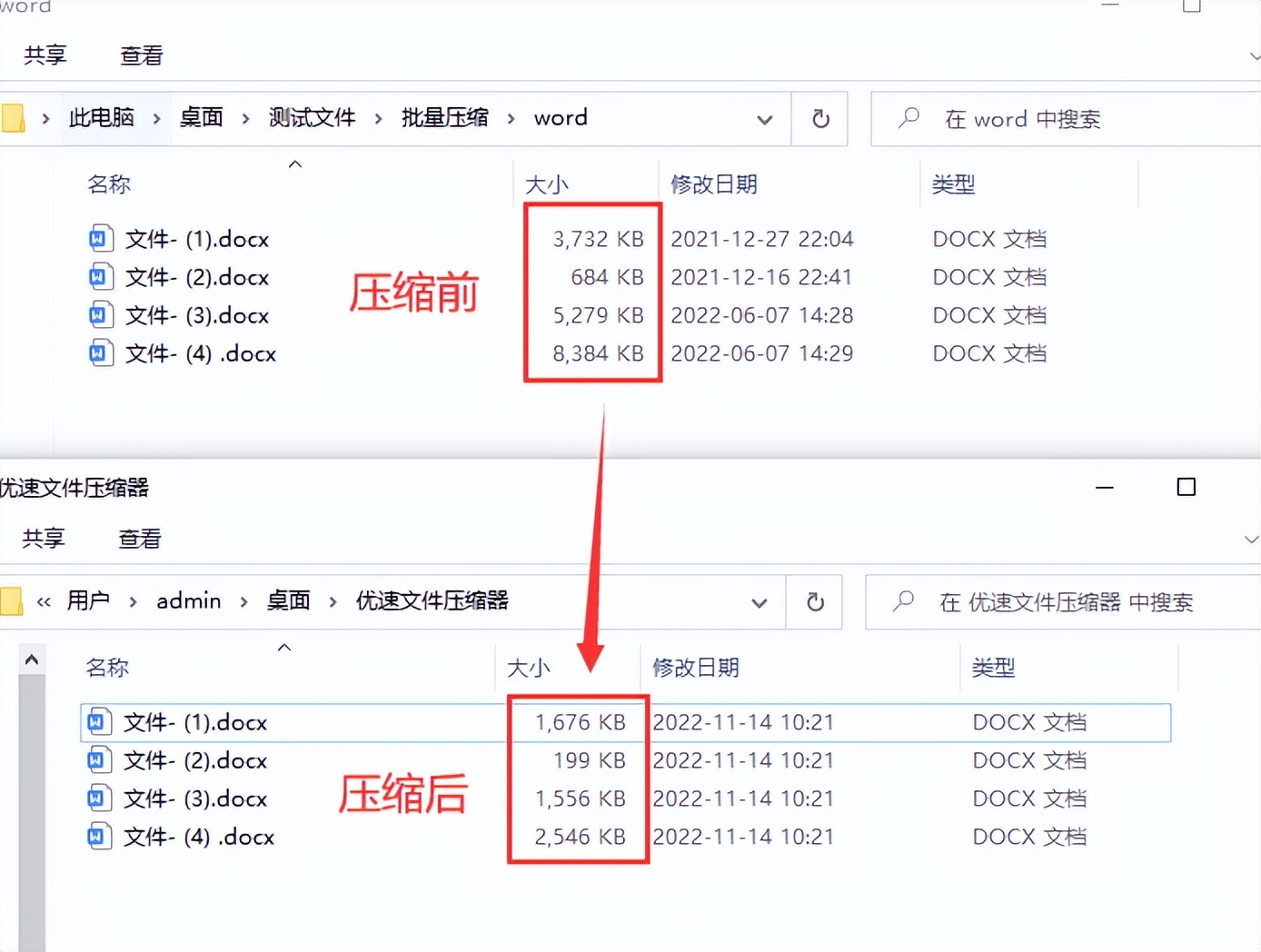 步骤5、压缩成功后,我们确认压缩效果,故将压缩前后的word文档进行对比,如图所示。压缩后word文档的kb比压缩前对应的文档的小了很多,说明软件压缩成功。