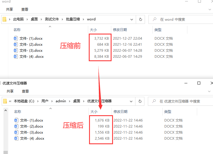 第五步:如图所示是压缩前后的word文档大小的对比图片,通过图片我们很明显的看出,压缩后的word文档比压缩前小了很多,说明我们的压缩方法很成功