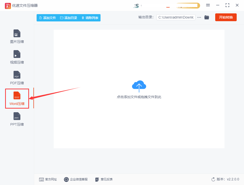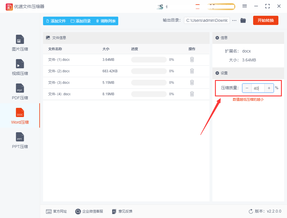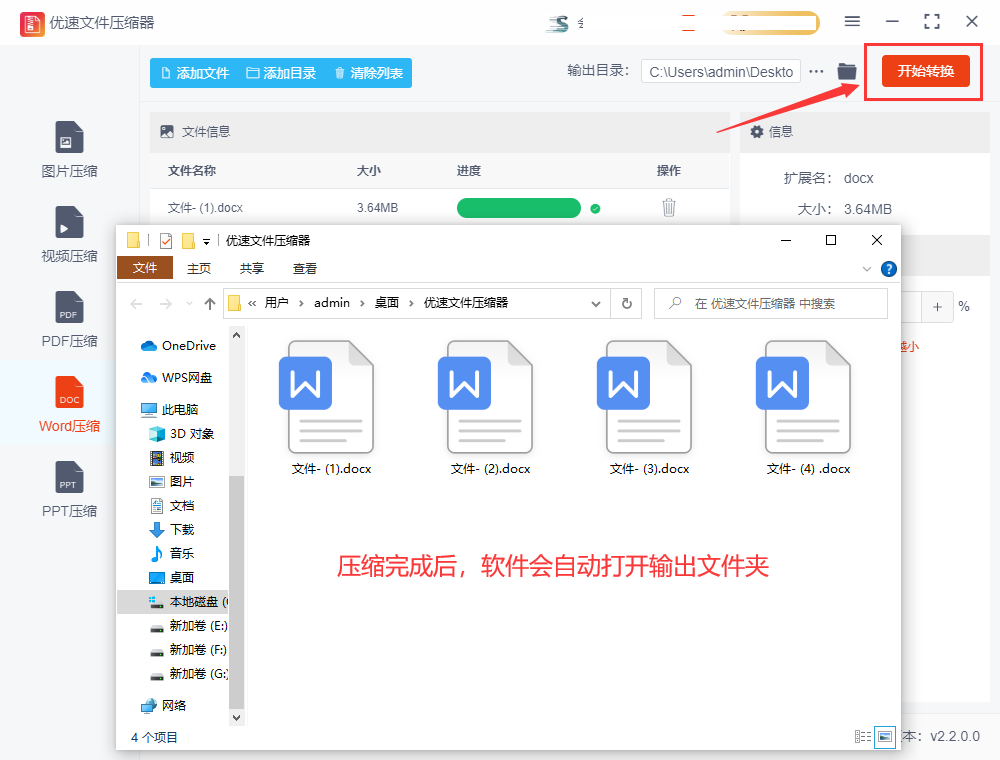 第四步:设置完成后,点击【开始转换】按钮,接下来软件会以最快的速度帮我们把上传的word文件进行压缩处理,当压缩完成后,软件会自动弹出,打开输出文件夹。方便用户直接查看到压缩好的word文档。