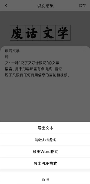 第一步,在应用商城中找到“文字提取扫描王”下载安装并打开。第二步,点击拍照识字,然后在相册中打开需要转换为Word文档的图片或者直接使用相机拍摄新的照片。第三步,设置需要转化的比例和范围。第四步,识别完成后就可以看到识别结果了,然后点击保存,再选择“导出Word格式”按钮就完成了。