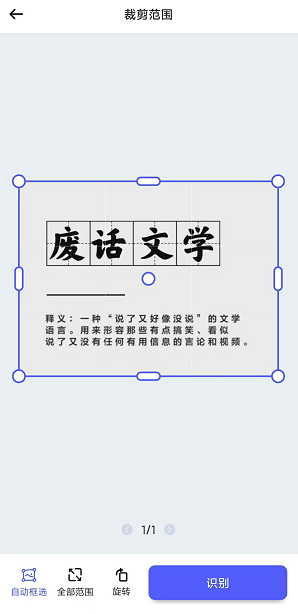 第一步,在手机应用商城中下载“风云扫描王”。第二步,打开后在首页中找到并点击“文字识别”功能。第三步,然后将图片打开,然后裁剪范围。在其中找到需要需要转换为Word文档的范围。第四步,点击识别,然后在识别结果中将需要的片段复制到Word文档中就完成了。