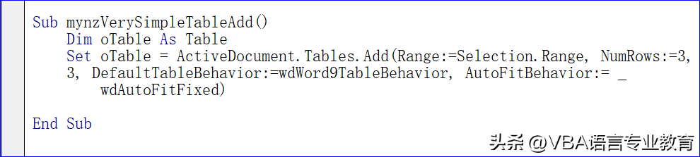 Set oTable = ActiveDocument.Tables.Add(Range:=Selection.Range, NumRows:=3, NumColumns:= _