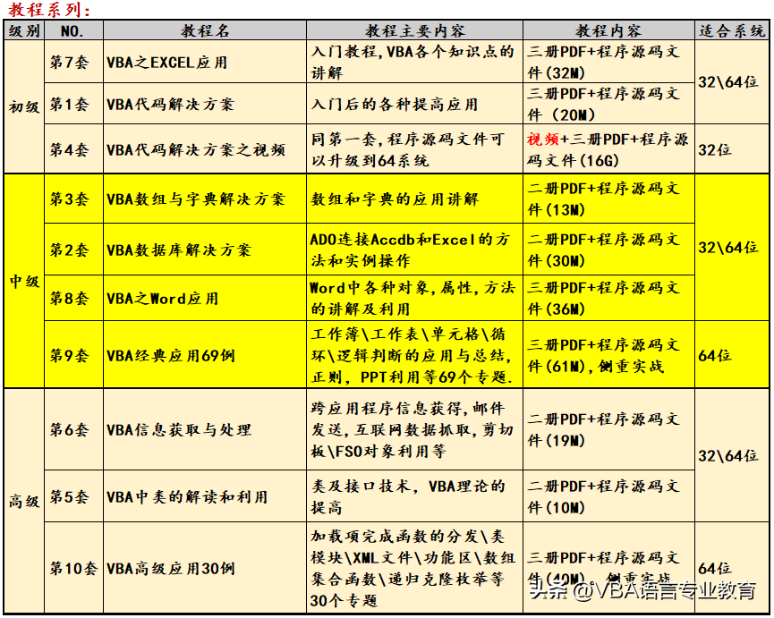 如果您VBA是入门阶段,可以选择7.1.3.9教程,第7套教程是入门,第1套教程是入门后的提高,第3套教程字典是必备的VBA之精华,第9套教程是实用的典型案例讲解。如果您有了一定的VBA基础可以根据自己的需要,进行教程的选择。教程提供的程序源码文件就如一座大型的代码库支持着大家的工作。同时还有实用的资料送给学员。