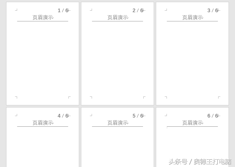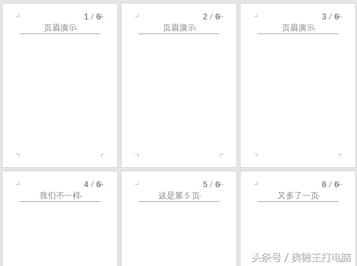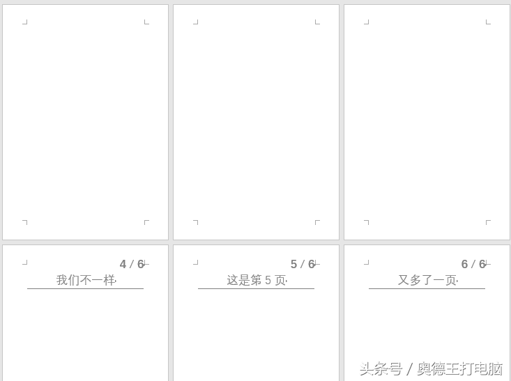 第一步,新建一个6页的文档,设定好页眉,一个标题和页码;
