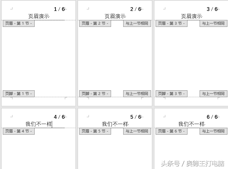 请试着改动任何一页的页眉,会看到其他的页眉都跟着发生改变。