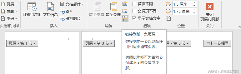 - 找不到【链接到前一条页眉】按钮,在页眉页脚工具设置界面上找,老版好像叫同上之类的名字。
