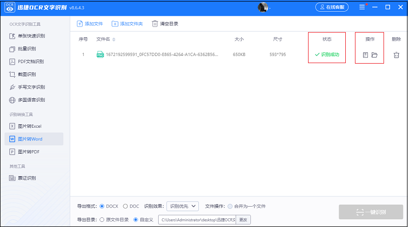 第三步:等待转换完成后,状态那里会显示识别成功的提示字样,然后点击操作下面的文件按钮打开转换后的word文档进行查看。