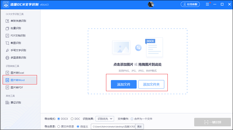 第一步:首先我们在电脑端打开迅捷OCR文字识别工具,然后在左侧识别转换工具下面找到图片转word功能,接着点击添加文件或者添加文件夹导入需要进行转换的图片。