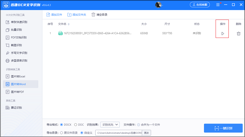 第二步:图片添加完成后,在页面底部设置导出格式,并选择识别效果,接着点击文件右边的操作按钮,系统将自动进行图片转word的操作。