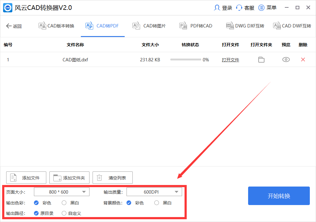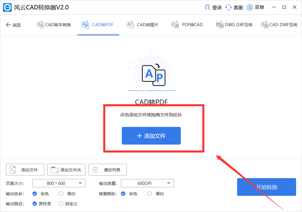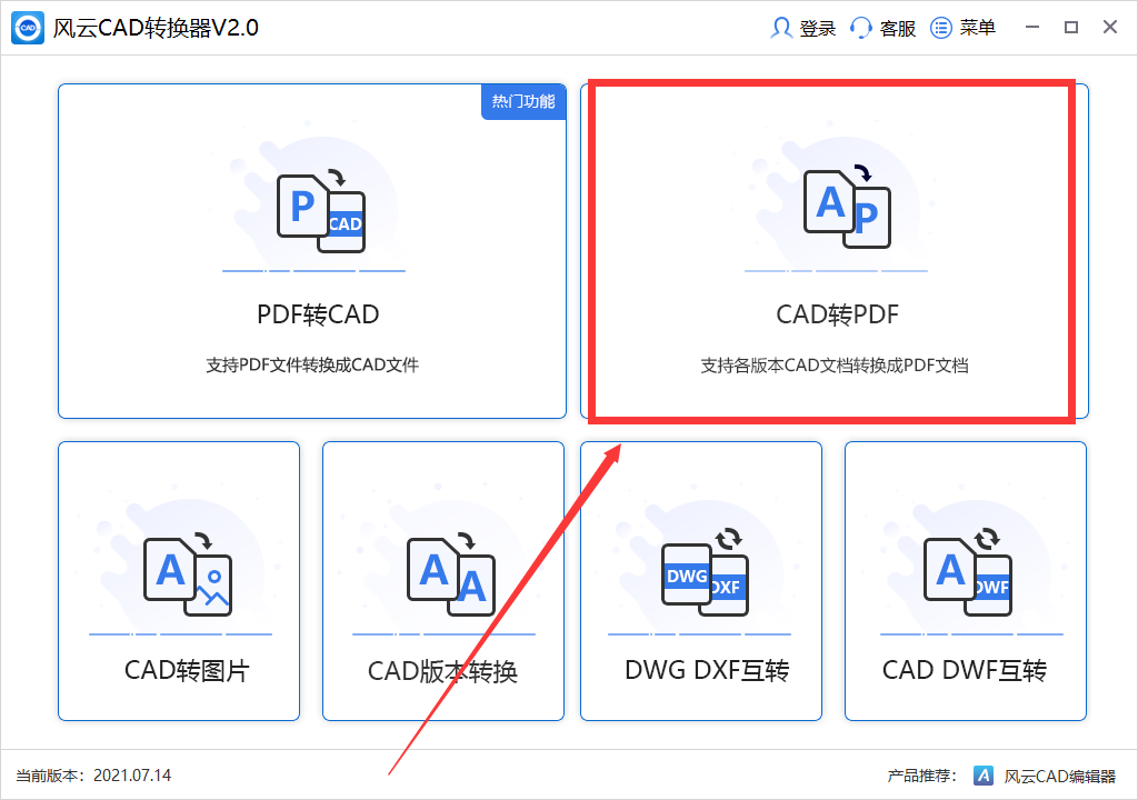 第一步:双击打开风云CAD转换器,进入到操作页面,界面看起来简洁舒适,各项功能都很直观,由于我们今天学习的是CAD转换为PDF的方法,所以选择第一行右侧的“CAD转PDF”功能;