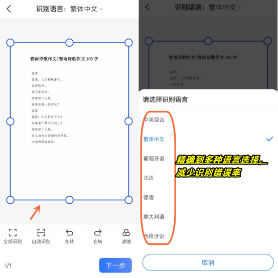 步骤二:将上传的图片进行区域选择,选择自己需要的文字,非常人性化,还可以选择需要识别的语言。