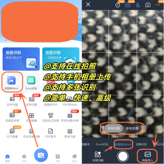 步骤一:打开手机软件界面,在首页找到【拍图转word】,其实还有很多识别,选择自己要的功能即可。你可以在线拍照文字识别,也可以上传图片来识别。