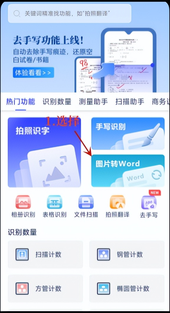 第一步:我们先打开手机,在里面找到这款软件并打开,来到识别页面后,选择页面当中的图片转word功能。