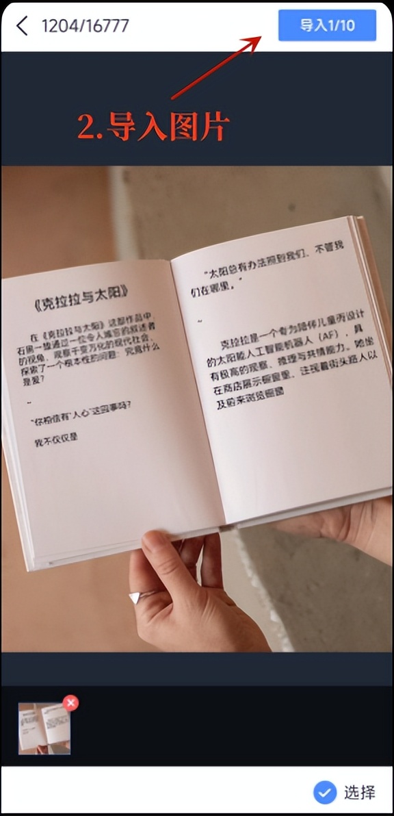 第二步:从我们的手机相册里面选择需要转换成word文档的图片来导入,注意一次最多支持导入十张图片。选择好图片后,选择右上方的【导入】按钮即可。