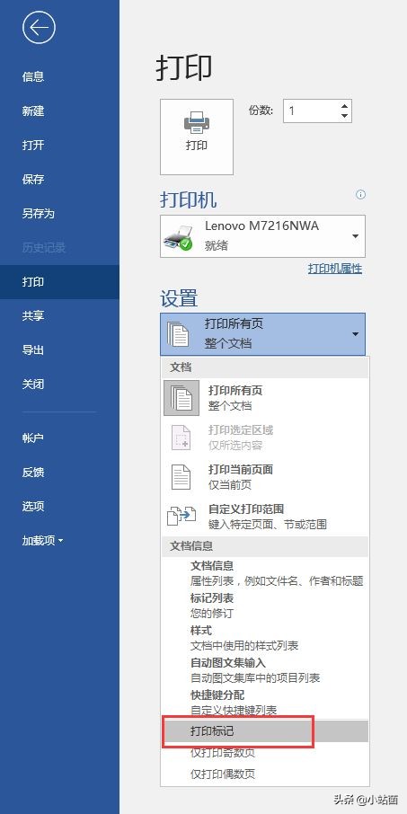方法一需要在文档中隐藏批注框,而本方法可以不隐藏批注框,只是在打印时单击“打印所有页”按钮,在打开的下拉列表中选择“打印标记”选项,将该选项前的“√”标记取消,在右侧的打印预览窗口中即可看到所有的批注框均未显示,即表示不再打印批注框啦!